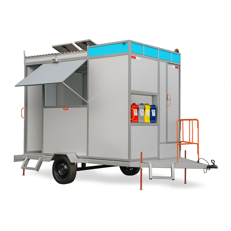 As paredes e cobertura são confeccionadas em chapa com tratamento térmico, proporcionando isolamento e conforto térmico mesmo sob sol intenso ou temperaturas baixas. A iluminação interna e externa em LED com bateria recarregável garante eficiência energética e autonomia, possibilitando o uso em locais sem acesso à rede elétrica.