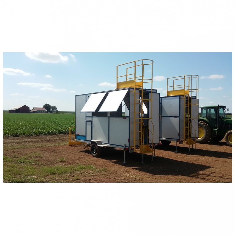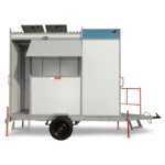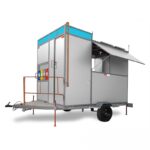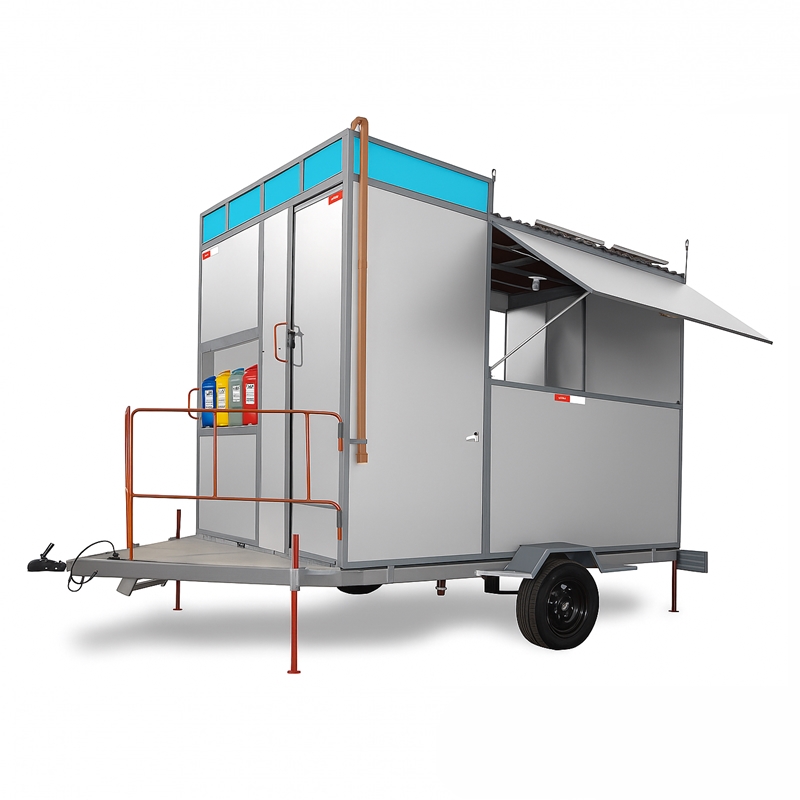 Construída sobre um reboque robusto, sua estrutura inferior é fabricada em chapa de aço de 3,2 mm, com homologação INMETRO, garantindo resistência, estabilidade e durabilidade mesmo em condições severas de uso. O piso em chapa de alumínio antiderrapante oferece segurança adicional, evitando escorregamentos e facilitando a limpeza do ambiente.