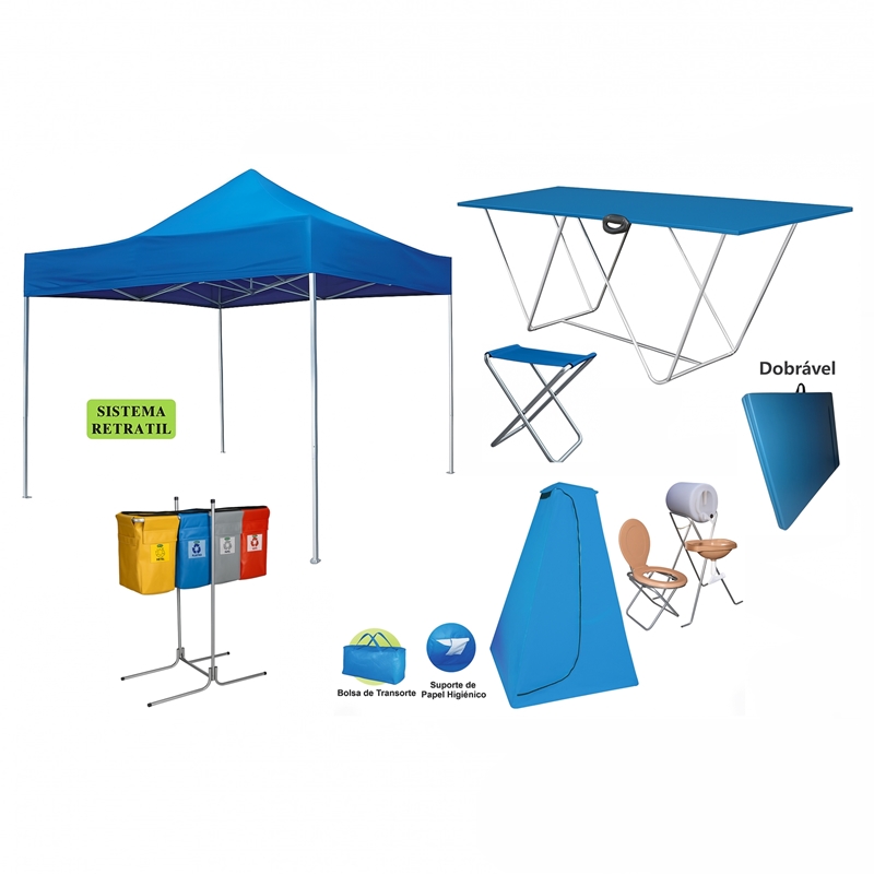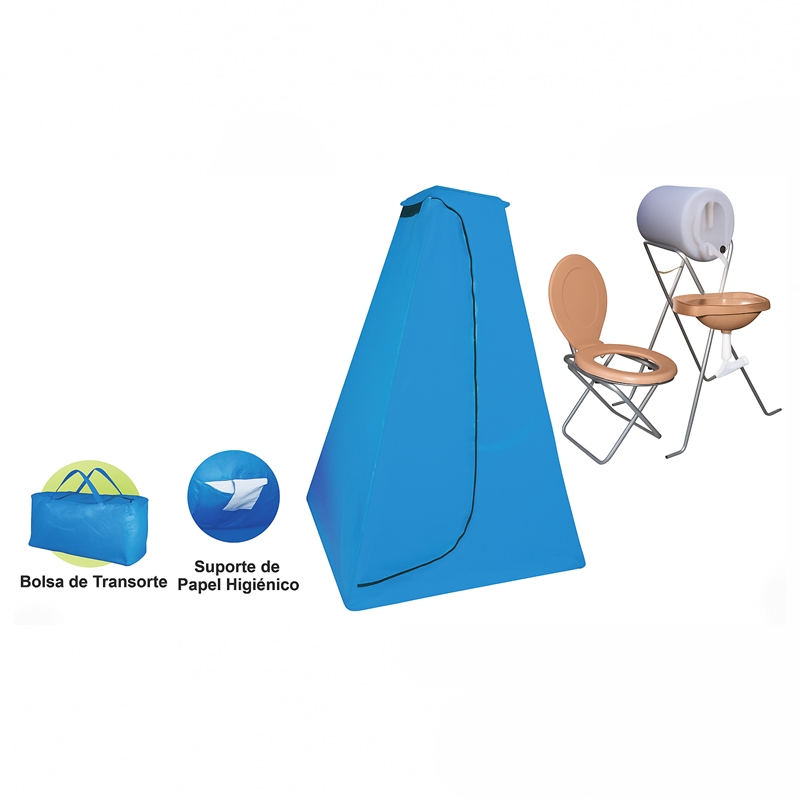Acompanha ainda a Barraca Sanitária Apache, fabricada em tubo 3/4” e lona NR31, equipada com lavatório e sanitário, garantindo condições adequadas de higiene e conforto aos trabalhadores, conforme as exigências das normas regulamentadoras.